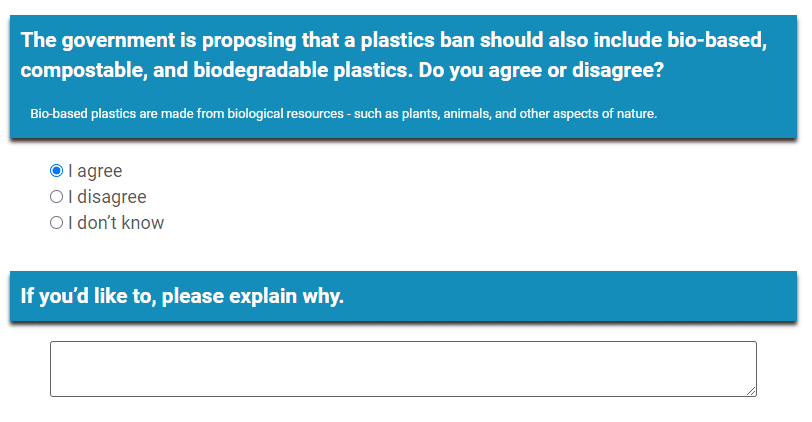 The government is proposing that a plastics ban should also include bio-based, compostable, and biodegradable plastics. Do you agree or disagree?